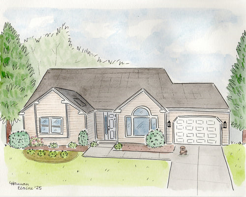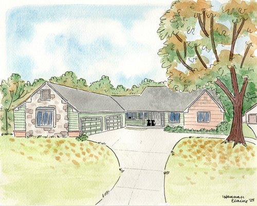 From looking at my artwork, it's no secret that I love drawing detailed buildings - especially homes! My custom home portraits make a beautiful keepsake for your own home, a personal gift for a loved one, or can even be turned into seasonal greeting cards.