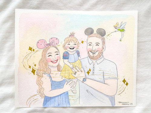 These portraits are more intricate than my "live watercolor portraits" that can be purchased in my shop. Your portrait can be completely customized from the number of people, size and background to specific clothes, accessories and details.